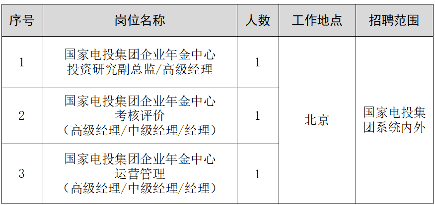 詳見(jiàn)《國(guó)家電投集團(tuán)企業(yè)年金中心公開(kāi)招聘崗位職責(zé)及任職條件》(附件1)。