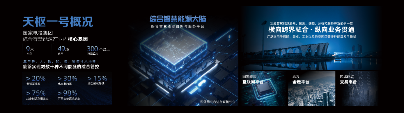 “天樞一號”綜合智慧能源管控與服務(wù)平臺,是集團(tuán)公司綜合智慧能源產(chǎn)業(yè)的核心基因,是集團(tuán)公司綠色發(fā)展品牌形象的重要載體,集成智慧能源監(jiān)視、預(yù)測、調(diào)控、分析和服務(wù)等功能于一體,廣泛適用于居民、商業(yè)、工業(yè)以及各類園區(qū)等多種能源應(yīng)用場景!疤鞓幸惶枴辈捎谩皺M向跨界融合、縱向業(yè)務(wù)貫通”的系統(tǒng)集成理念,對智慧城鎮(zhèn)、集群樓宇、產(chǎn)業(yè)園區(qū)和能源基地等多個類別的能源系統(tǒng)進(jìn)行集成,滿足支撐數(shù)據(jù)共享、安全通信、互聯(lián)互通、場景聯(lián)動、靈活參與,實現(xiàn)業(yè)務(wù)融合和少人值守,為綜合智慧能源多區(qū)域、多場景的管理提供統(tǒng)一的解決方案。可幫助能源公司由能源供應(yīng)商向綜合能源服務(wù)商轉(zhuǎn)變,實現(xiàn)一站式綜合服務(wù),給用戶提供電、熱、冷、氣、水等多種能源及相應(yīng)配套運維服務(wù)。還可以和國家能源互聯(lián)網(wǎng)平臺、區(qū)域能源交易平臺、地方金融平臺等外界平臺進(jìn)行有機(jī)融合,實現(xiàn)全國跨服務(wù)區(qū)域的資源調(diào)配,確保項目運營過程資源、資金安全,并為區(qū)域后續(xù)項目預(yù)留接口,實現(xiàn)一平臺全方位服務(wù)。