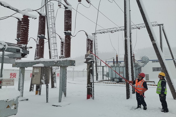 ▲為避免發(fā)配電、集電線(xiàn)路等設(shè)備產(chǎn)生積雪、覆冰,東方能源(河北公司、雄安公司)張家口中寶風(fēng)電場(chǎng)員工在保證安全的前提下,兩人一組每?jī)尚r(shí)對(duì)絕緣子積雪進(jìn)行清理,確保設(shè)備正常運(yùn)轉(zhuǎn)。