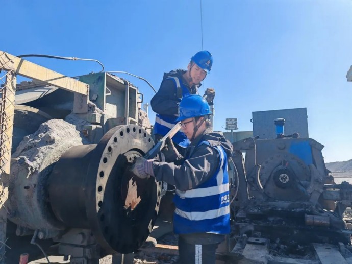 ▲內(nèi)蒙古公司南露天煤礦剝離運(yùn)行部技術(shù)骨干正在研究驅(qū)動(dòng)滾筒聯(lián)軸器鎖緊方式,為高效生產(chǎn)增添動(dòng)力。